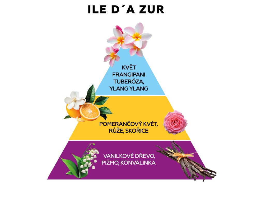 Okouzlující esence frangipani a ylang-ylangu se mísí s elegancí bílých květů, zatímco sladká svěžest pomerančového květu to vše rozjasňuje. V pozadí krémová vanilka zahaluje tuto květinovou symfonii a přináší návykové teplo, jako sluneční aura, která inspiruje pohodu a pozitivitu.